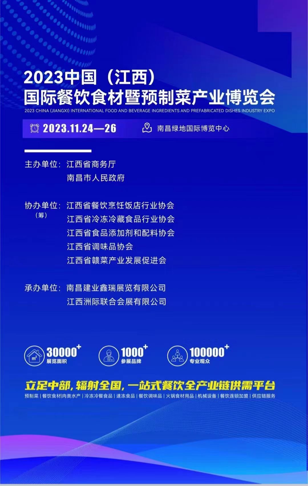 展会介绍: “2023中国(江西)餐饮食材展暨预制菜产业博览会”将于11月24日-26日在江西南昌绿地国际会展中心隆重举行!本次展会由江西南昌建业鑫瑞展览有限公司承办,1000家餐饮品牌 ,聚焦预制菜革命,旨在深度探索和思考预制菜行业,助推预制菜赛道跑出国民级品牌。