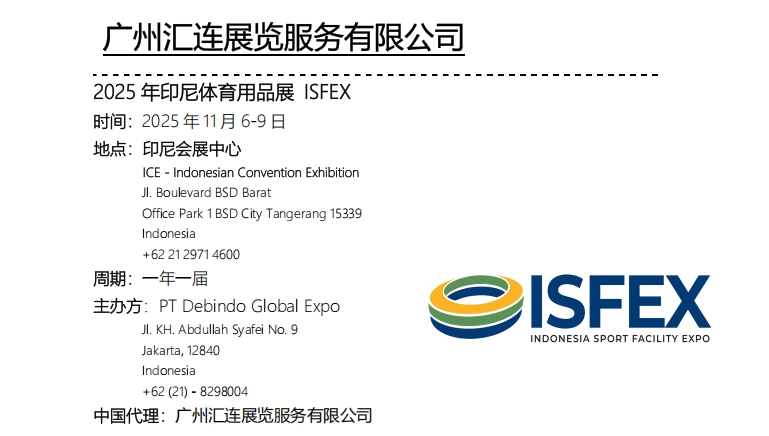 2025 年印尼体育用品展 ISFEX 时间:2025 年 11 月 6-9 日 地点:印尼会展中心
