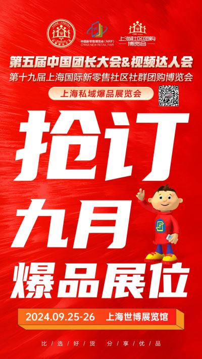 地点:第十九届上海国际新零售社区社群团购博览会 时间:2024年9月25-26日 地点:上海世博展览馆(博成路850号)